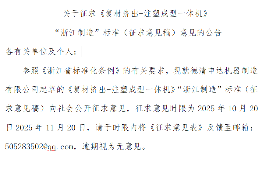 各有關(guān)單位及個人:參照《浙江省標(biāo)準(zhǔn)化條例》的有關(guān)要求,現(xiàn)就德清申達(dá)機器制造有限公司起草的《復(fù)材擠出-注塑成型一體機》“浙江制造”標(biāo)準(zhǔn)(征求意見稿)向社會公開征求意見,征求意見時限為2025年10月20日2025年11月20日,請于時限內(nèi)將《征求意見表》反饋至郵箱:505283502@qq.com,逾期視為無意見。附件:關(guān)于征求.docx團體標(biāo)準(zhǔn)?71.docx征求意見表.docx編制說明.doc